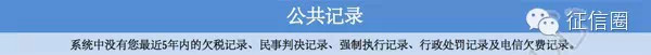 “公共记录”包含您最近5年内的欠税记录、法院民事判决记录、强制执行记录、行政处罚记录、电信欠费记录。当您没有公共记录时,该部分不展示明细信息。