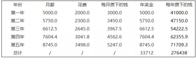 所以毕业后第一年月薪5000元:总计花费2000元/月,每个月能攒3000元/月!