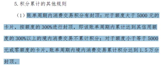 卡片额度小于等于5000元的,1.5万积分封顶。