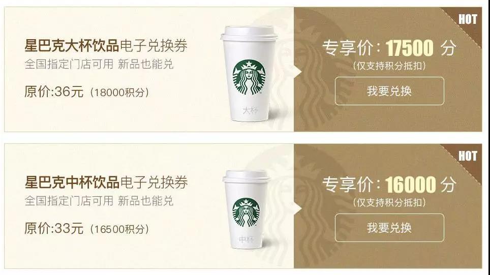 周一至周日刷15000中行信用卡积分,即可兑换星巴克大杯手工调制饮品一杯(特殊饮品除外),每卡每日兑换杯数不限量。