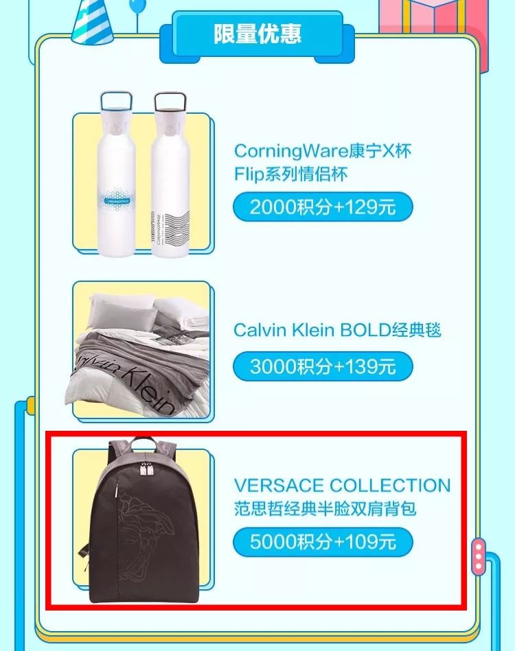 8月份过生日的朋友有三种选择,最划算的是5000积分+109块兑换范思哲的双肩包。