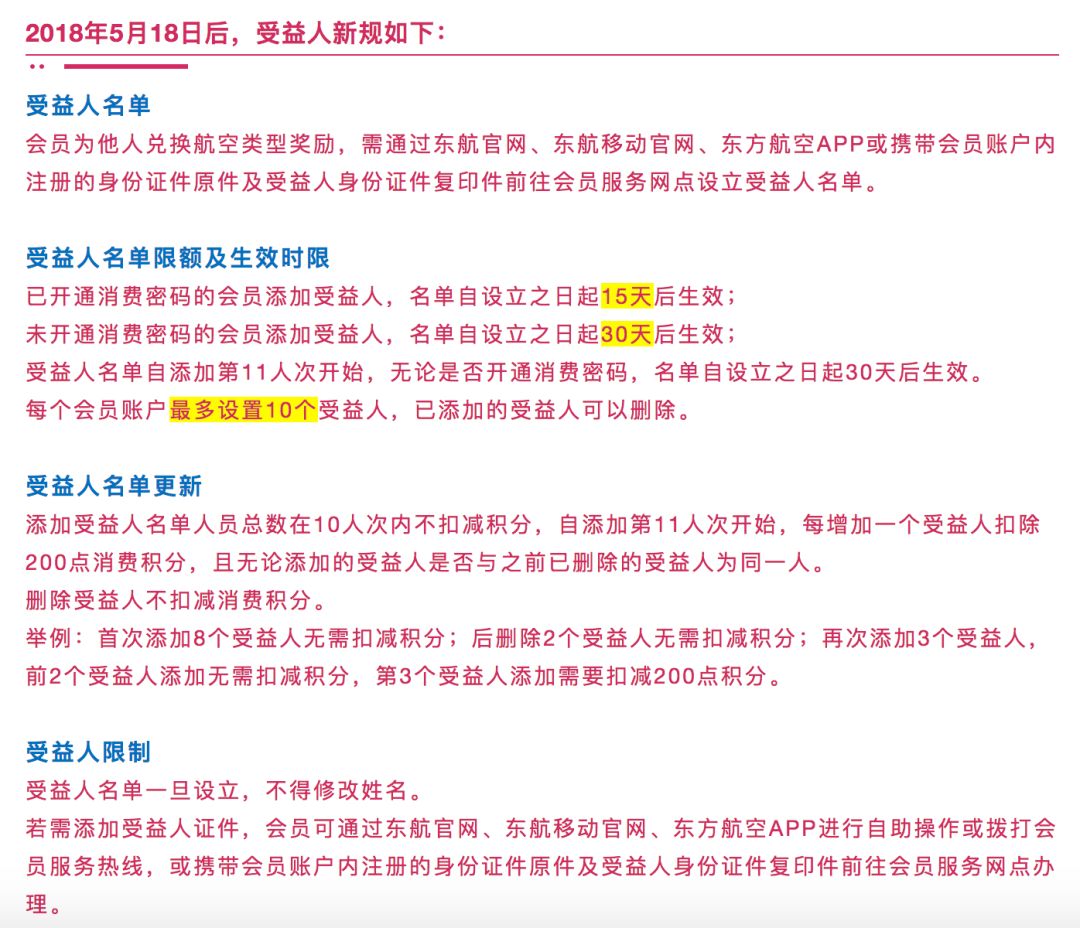 自18年5月18日起,通过东航APP-会员服务,或者东方万里行官网—个人信息—密码服务管理等途径,开通消费密码,用户可设立一个最高10个人的受益人名单,15天后就能生效;未开通的,也只要30天。比原来60天好太多...