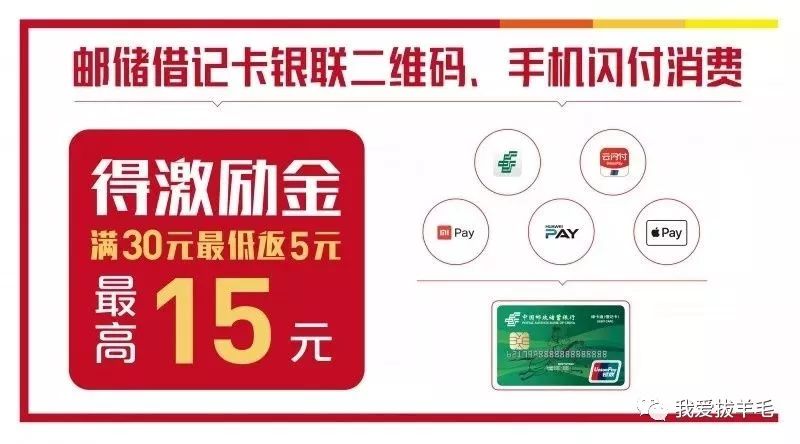 通过邮储银行手机银行、云闪付APP、手机闪付(含ApplePay、MiPay和HuaweiPay)绑定邮储银联借记卡,在支持银联二维码消费或手机闪付的线下商户,使用银联二维码或手机闪付跨行消费单笔满30元,即可获得最高15元、最低5元激励金返现。名额有限,先到先得哦!!