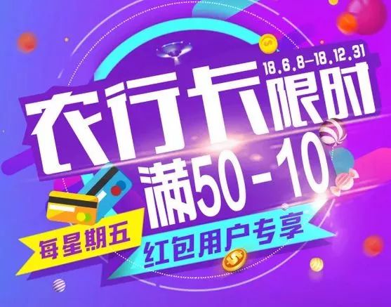 活动期间每周五,翼支付APP绑定中国农业银行卡(借记卡)指定消费满 50-10 优惠。