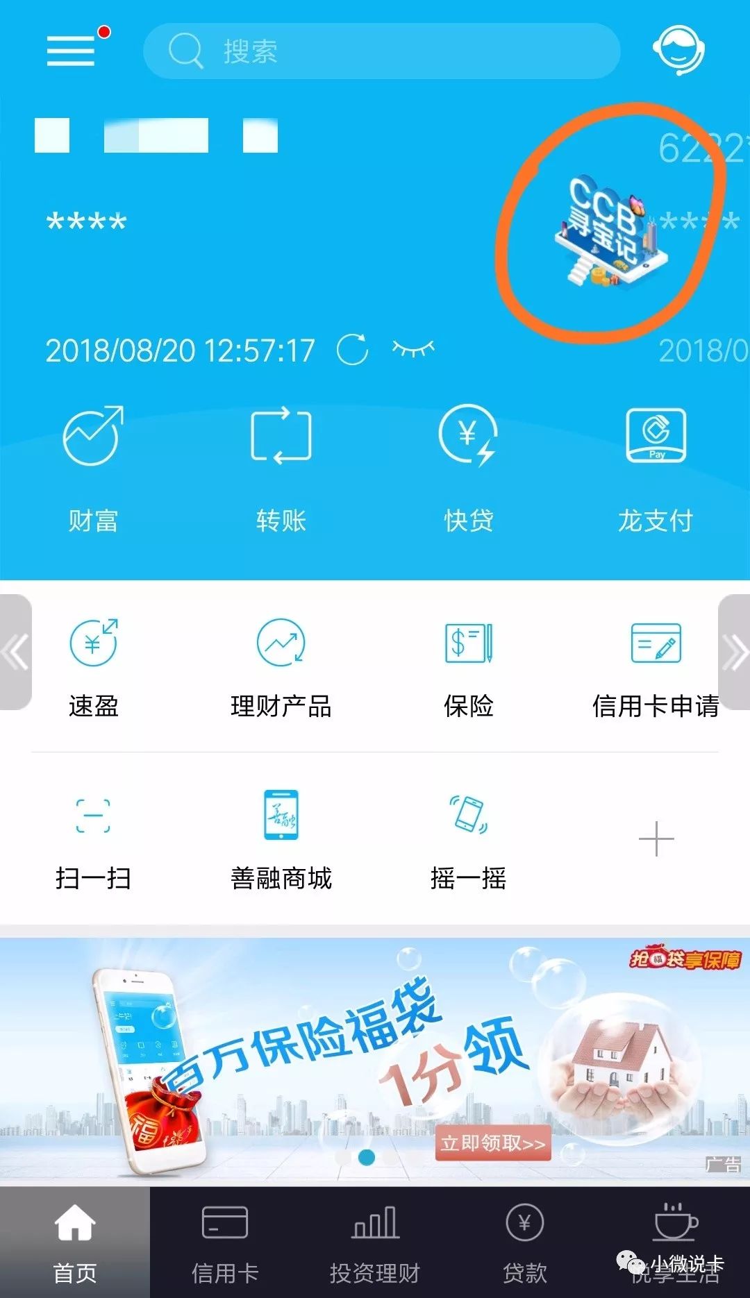 建设银行手机银行app首页,右上角CCB寻宝记图标,点击图标即可进入活动,如下图所示