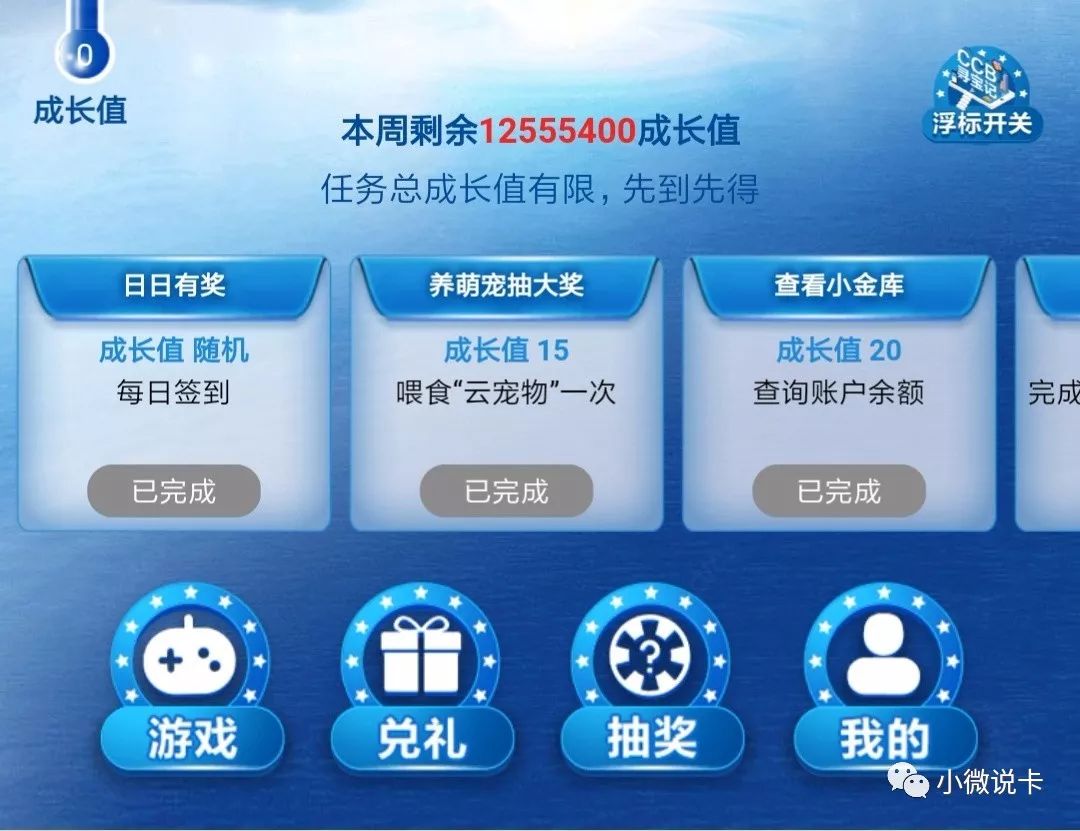 一个是每日任务,其中签到可获得随机成长值,后面的三个任务每个人是不同的,但是看来都没什么难度,小微的是查余额和转账,非常简单,完成任务即可获得指定的成长值,任务每日10点会更新。