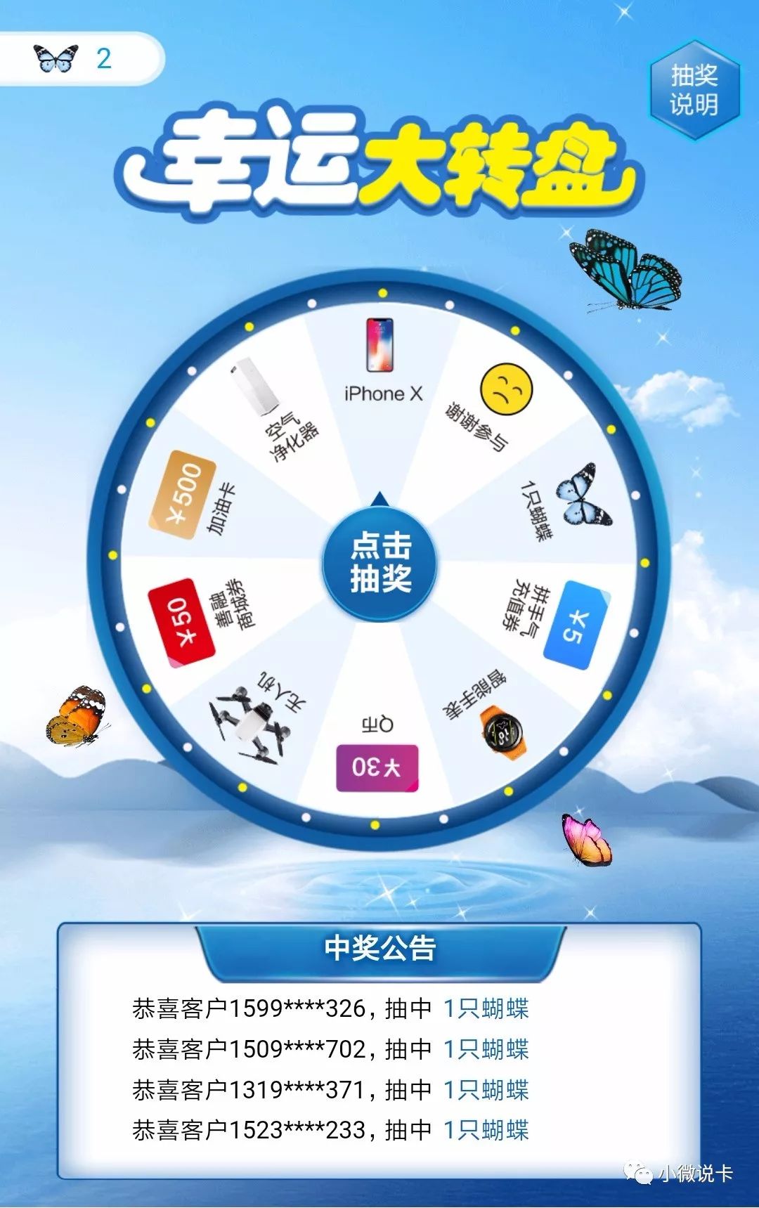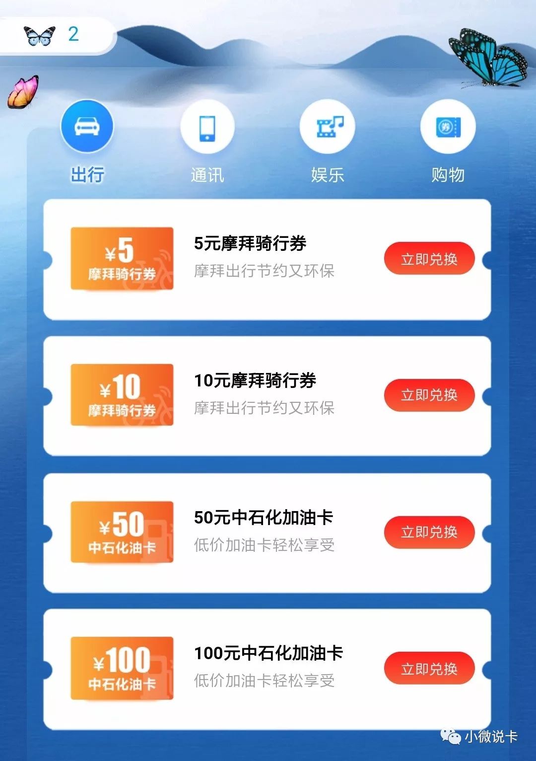 获取的成长值每50点会自动转换成一只蝴蝶,有了蝴蝶我们就可以兑换礼品或者抽奖了,可以兑换的礼品有加油卡,话费,购物卡,视频会员等,就不一一展示了。