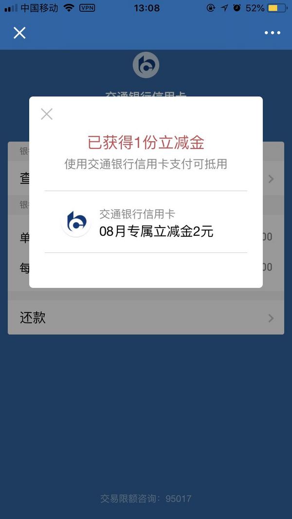 交通银行信用卡用户进入微信钱包,在卡包中选择交通银行信用卡,点击即可获得一张2元或者5元代金券,满2.01元/5.01元可用,每人限领1张。