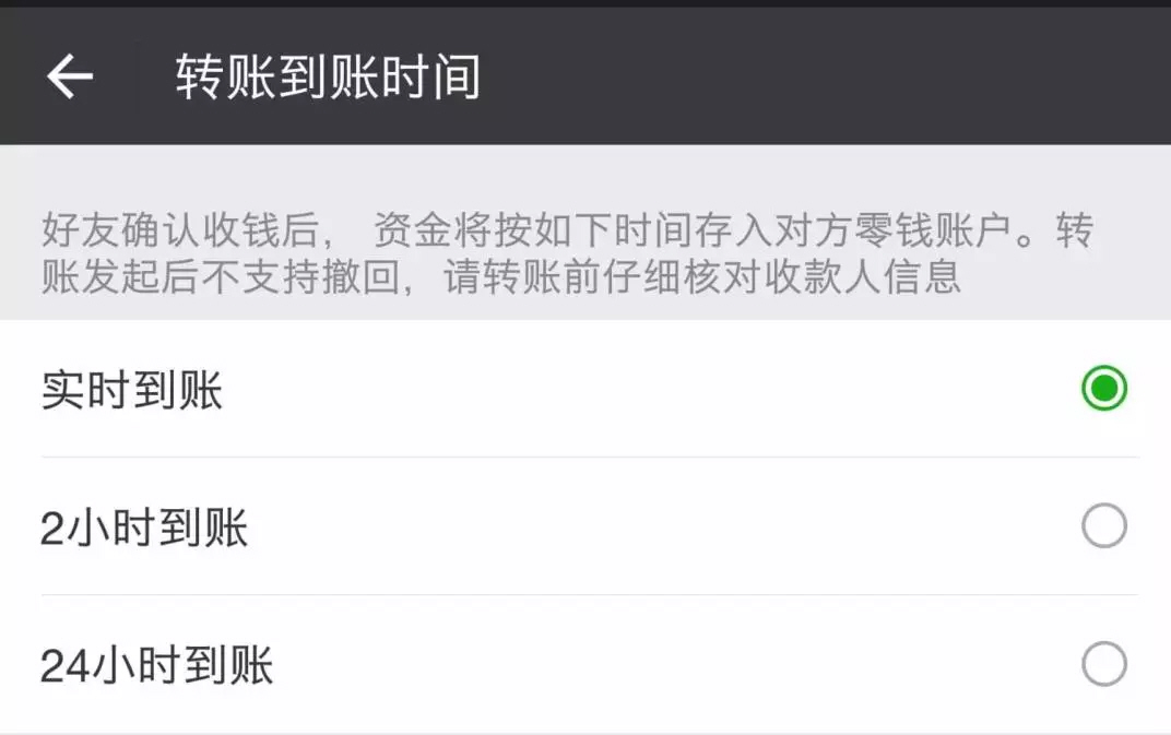 微信转账:我们可以打开钱包,点击右上角的田字形的图标,在“支付管理—转账到账时间”,就能选择到账的时间,最长是24小时。