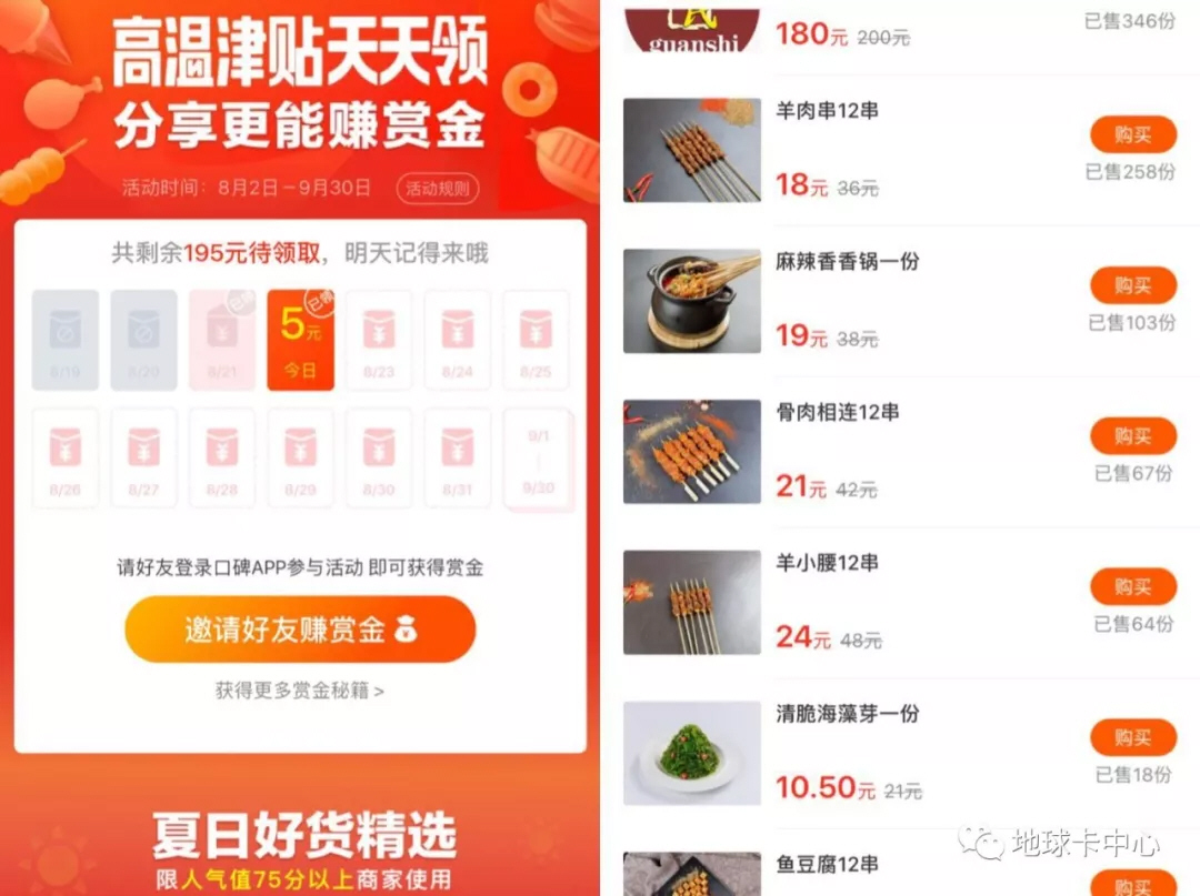 这里分享一个小技巧,口碑App高温津贴每天可以领5元,如果比较能撸串呢,可以再去所在商户下几单半价商品,超级划算的~