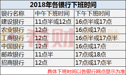 不同的银行,下班时间不同,哪怕是同一个银行,不同网点的下班时间也不同。基本上银行最早会在下午16点下班,晚的时候可能会在18点下班。大家要做的,就是尽可能早点去银行网点排队亦或者通过网上预约拿号,这样就可以赶在下班前尽快办理完业务。