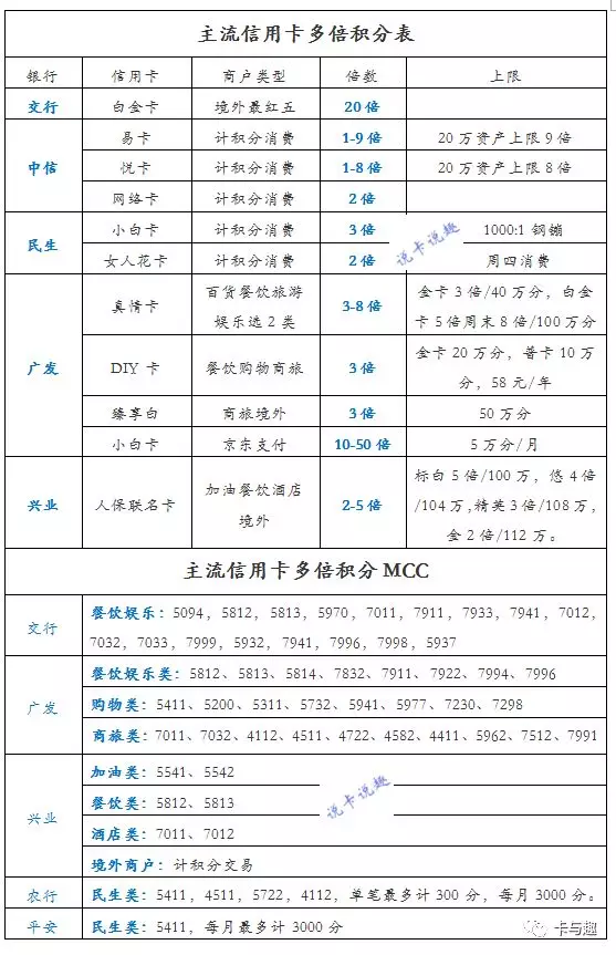 往往在百货、餐饮、商旅、娱乐、加油及境外这几类商户刷信用卡可获得多倍积分,不同银行的多倍积分有不同的条件,大多数对MCC有要求,主流信用卡多倍积分表及多倍积分MCC供大家收藏使用。