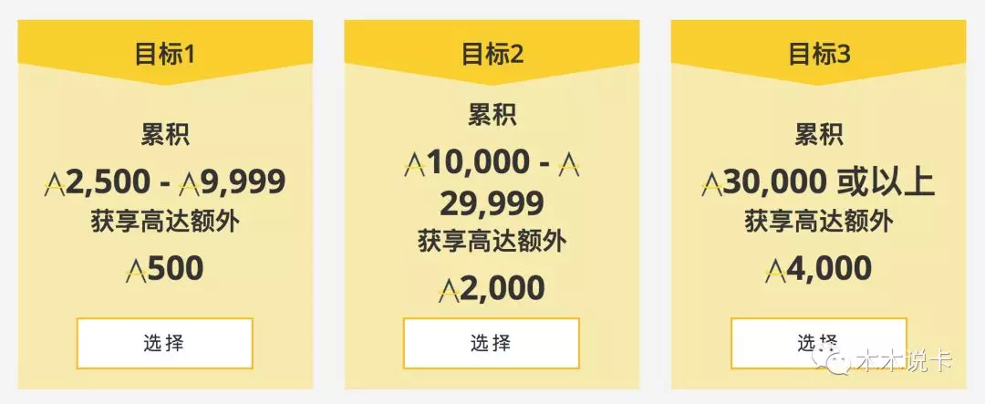 选目标,木木选了目标3,亚万里程累计3万里程以上额外赠送4000里程,目前信用卡积分多并且亚万里程有需求,所以选择了最高一档提交,大家按自己需求选择: