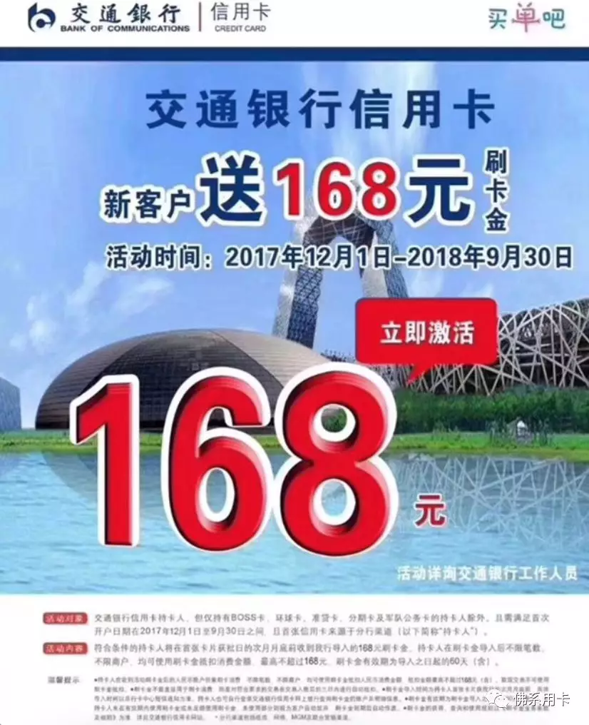 这个刷卡金需要在本公众号的办卡渠道,全国新户下卡就可以享有,但是这刷卡金的保留是有有效期的,需要在你下卡后的45天内激活卡片,才可以享受这专属渠道的168元。活动到9月底,交行新户抓紧咯