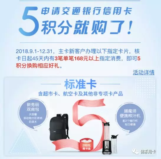9.1到12.31号,新户下卡再45天内消费3笔单笔在168元以上,就可以5积分换购。如果你申请的是YE优逸白金卡、沃尔玛卡、被降级的标准金卡,都可以用5积分换200元刷卡金。