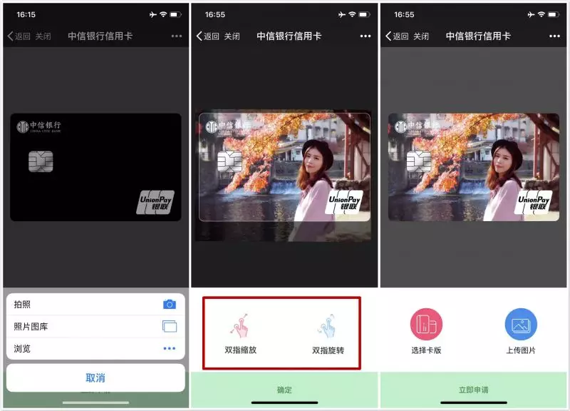 自定义卡面上传通道,在此:https://creditcard.ecitic.com/h5/shenqing/yan_x/dingzhi