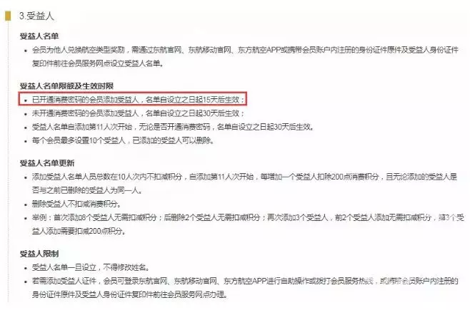 添加受益人30天生效 --- 对比:国航需要60天生效,东航需要15天,(南航二卡也是30天);