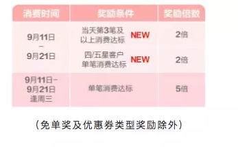 优惠1:单笔消费满人民币10元及以上,可通过广发银行“发现精彩”App参与抽奖,最高有机会享受免单优惠,满足以下奖励条件可享受多倍奖励优惠。