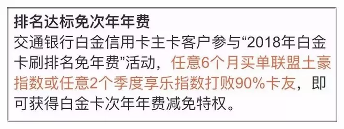 16 目前,交行所有卡都不是刚性年费。新户下大白金卡45天内3笔168可以免首年年费,大白金卡里白麒麟可以用25万积分抵扣(航空联名白金卡不行),也可以任意6个月指数达标可以免次年年费。