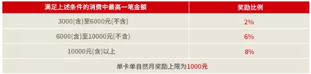 活动期间,用户使用北京银联“62”开头信用卡在境外(除港澳台)通过银联网络POS进行可计积分消费(不含线上交易),单卡单自然月消费满5笔(含)且每笔金额均满等值人民币200元(含),当满足上述条件的消费中最高一笔消费金额超过等值人民币3000元时,可享该笔金额2%至8%的奖励,具体奖励档位见下表。单卡单自然月最高奖励不超过1000元。活动期间单卡累计奖励不超过人民币3000元。金额有限,奖完为止。