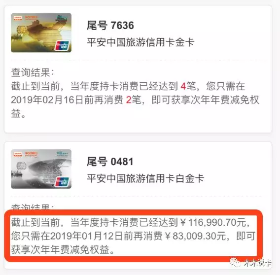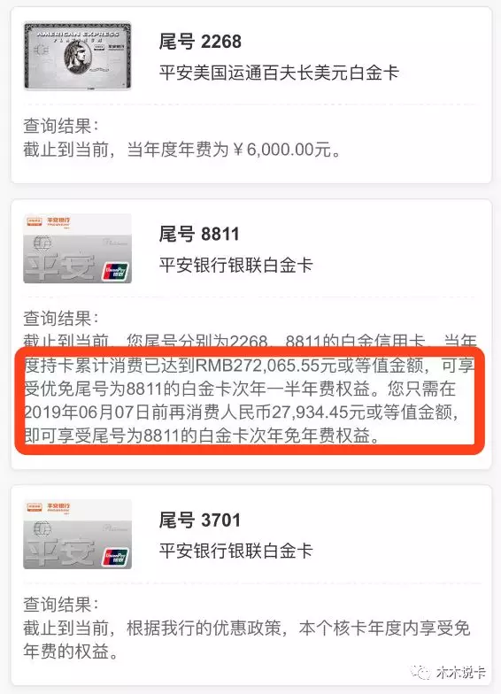 好在招商银行客服MM帮木木申请了刷卡减免年费,挽回了我450票票呀!平安信用卡软件的年费管理展示最一清二楚了,消费多少免年费,全部展示,这要为平安点个赞。
